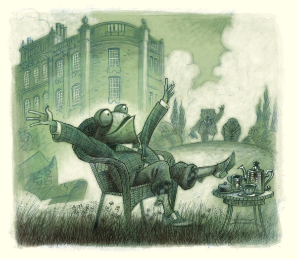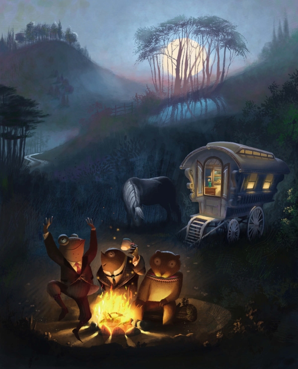 Поздним вечером, усталые и счастливые, находясь уже очень далеко от дома, они свернули на пустырь, распрягли лошадь, чтобы она попаслась. Они уселись поужинать на травке возле повозки. Мистер Тоуд хвастался тем, что он предпримет в ближайшие дни, а звёзды вокруг них всё разгорались и разгорались, и жёлтая луна, которая молча появилась неизвестно откуда, придвинулась, чтобы побыть с ними и послушать, о чём они говорят. Наконец они улеглись на свои коечки, и мистер Тоуд, блаженно вытягивая ноги под одеялом, сказал сонным голосом: