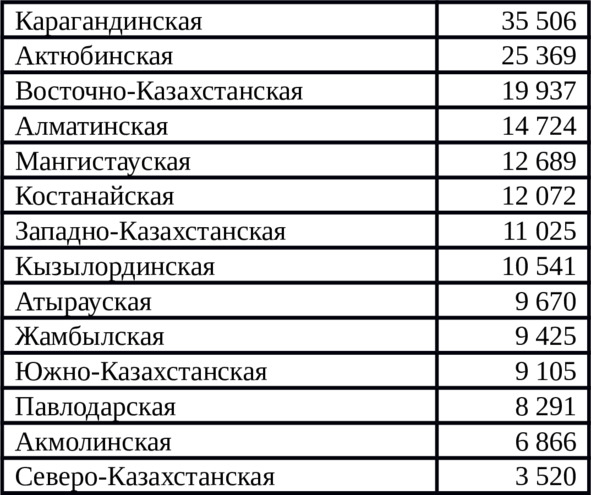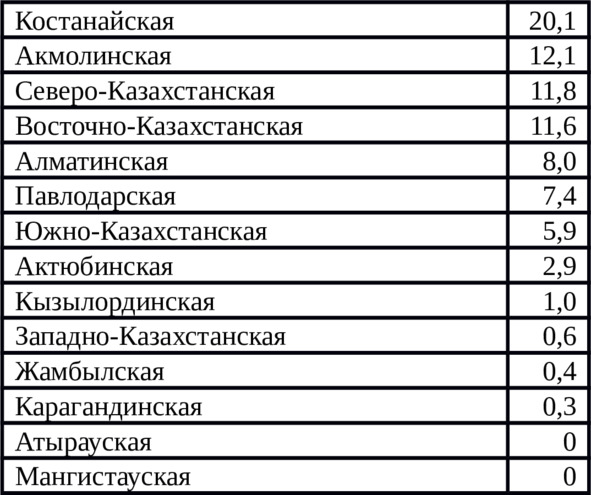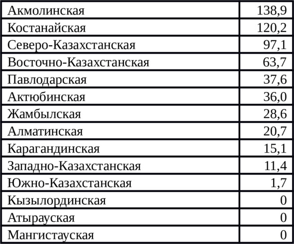 Рассмотрим ниже площади пастбищ по областям Казахстана: