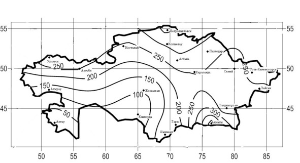 Карта-схема количества осадков Казахстана за теплый период года (с апреля по октябрь включительно) с 2000 по 2012 г.г., в мм (по А. К. Жексенбаевой, 2013)