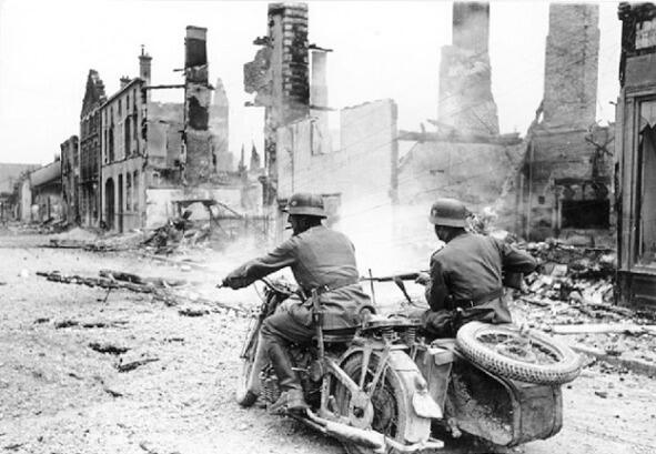 The battle continues to unfold in neighboring Belgium. Here, on May 1011, French, British, Belgian troops and Wehrmacht units converge. The first really grand operation of the Germans begins almost a failure. In the vicinity of Luxembourg, a motorized column of 41,000 units of equipment, a bumper to the bumper, gets into a 250-kilometer traffic jam. However, the bewildered allies never bombard this light target. Finally, 1,100 tanks break away from infantry clusters and break through mountain serpentines into Belgium. Three days later, steel cars, with crews tightly tucked in pervitin, almost seamlessly cross the borders of France.Photography German scouts are moving along the street of the destroyed French city