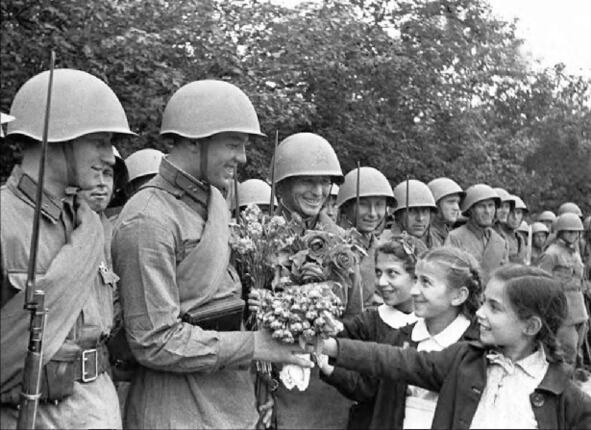 Representatives of the young generation of Bessarabia (Moldavia) present flowers to the soldiers of the Red Army