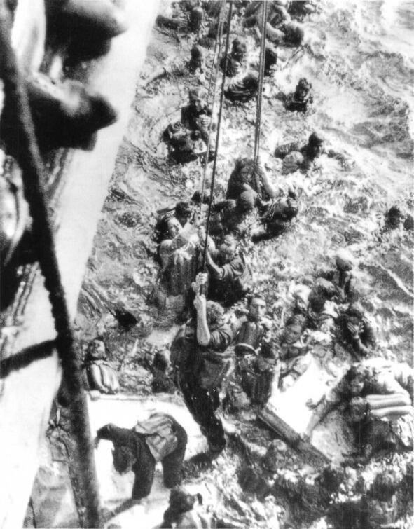 The roll negatively affects the accuracy of the Bismarck. British shells destroy the main ranging post and damage the tower. English heavy cruiser hits superlinkor with three torpedoes. The ship flips up the keel. Out of 2,220 people, 114 are saved (three are taken up by a German submarine that has approached). Since then, the German command covers the strike force of the surface fleet, especially in the winding Norwegian fjords. German kriegsmarine go to the tactics of unlimited submarine warfare. If before, before sinking the transport vessel, the crew of the submarine was obliged to give the appropriate signals, wait until the seamen sail into the boats, now there are no such tenderness. Photography the surviving sailors of the Bismarck ascend a British ship