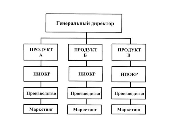 – Продуктовая структура. Дивизионы создаются по видам продукции.