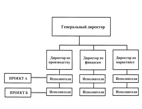 Матричная организационная структура (Рис.1.6.). В связи с необходимостью ускорения темпов обновления продукции возникли программно-целевые структуры управления, получившие названия матричные. Суть матричных структур состоит в том, что в действующих структурах для реализации целевых проектов создаются временные рабочие группы, при этом руководителю группы в двойное подчинение передаются ресурсы и работники других подразделений. Этим достигается гибкость в распределении кадров, эффективная реализация проектов. Зачастую матричную структуру применяют компании, выполняющие крупные проекты по государственному заказу.