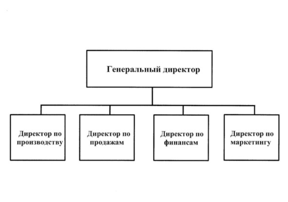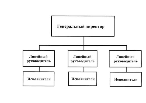 Линейная организационная структура представлена на рис.1.1, для нее характерна вертикаль: высший руководитель (как правило, генеральный директор) – линейный руководитель (подразделения) – исполнители. Имеются только вертикальные связи. В небольших предприятиях отдельные функциональные подразделения отсутствуют, эта структура строится без выделения функций.