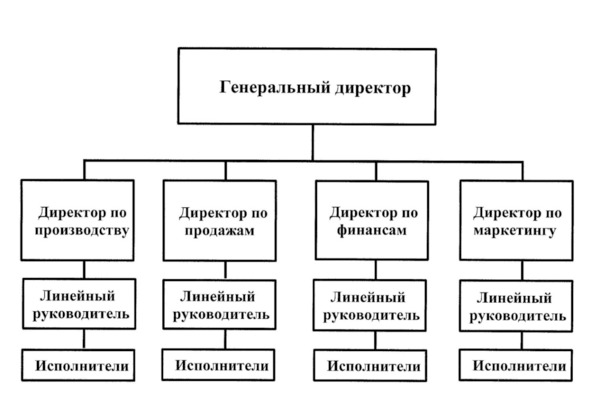 Функциональная организационная структура (рис.1.3). При дальнейшем усложнении производства возникает необходимость специализации работников, участков, отделов, цехов и т. д., формируется функциональная структура управления, распределение работ происходит по функциям. При функциональной структуре происходит деление предприятия на элементы, каждый из которых имеет определенную функцию, задачи. Она характерна для предприятий с небольшой номенклатурой, стабильностью внешних условий. Здесь имеет место вертикаль: руководитель – функциональные руководители (производство, маркетинг, финансы) – исполнители. Присутствуют вертикальные и межуровневые связи.