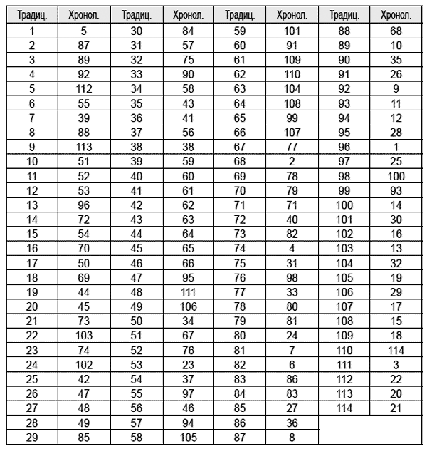 Таблица хронологической нумерации глав (сур) Корана и параллельно – нумерация традиционная