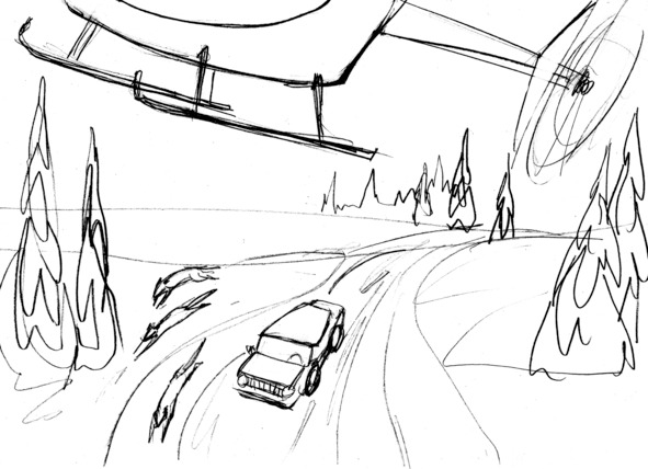 Впереди по трассе на чёрном небе прыгают два огонька, красный и синий. Вертолёт опускается ниже и скользит прямо над дорогой. За воем урагана он слышит щелчки выстрелов и мелкие вспышки, как будто в небе чиркают спичкой. Он опускает стекло и вглядывается в черноту. Волки, так и есть. Огромная стая волков бежит по краям дороги вровень с машиной и краткие выстрелы с вертолёта выхватывают из серого потока то одного, то другого зверя. Подстреленный волк, скуля, выпрыгивает вертикально вверх, как будто ударившись о невидимую стену, и падает в месиво рычащих ощетинившихся спин.