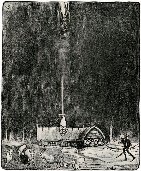 Если бы она почаще оглядывалась по сторонам, то заметила бы, что за ней неотступно кто-то следует от самого дома! Это был крохотный человечек с морщинистым лицом – не кто иной, как домовой[1]. Когда Дага спала, он сидел рядом и наблюдал, чтобы волк, медведь или другой зверь не причинил ей вреда. Если же дикие звери всё-таки подбирались к девушке, домовой смотрел на них так злобно, что те тотчас убегали прочь.