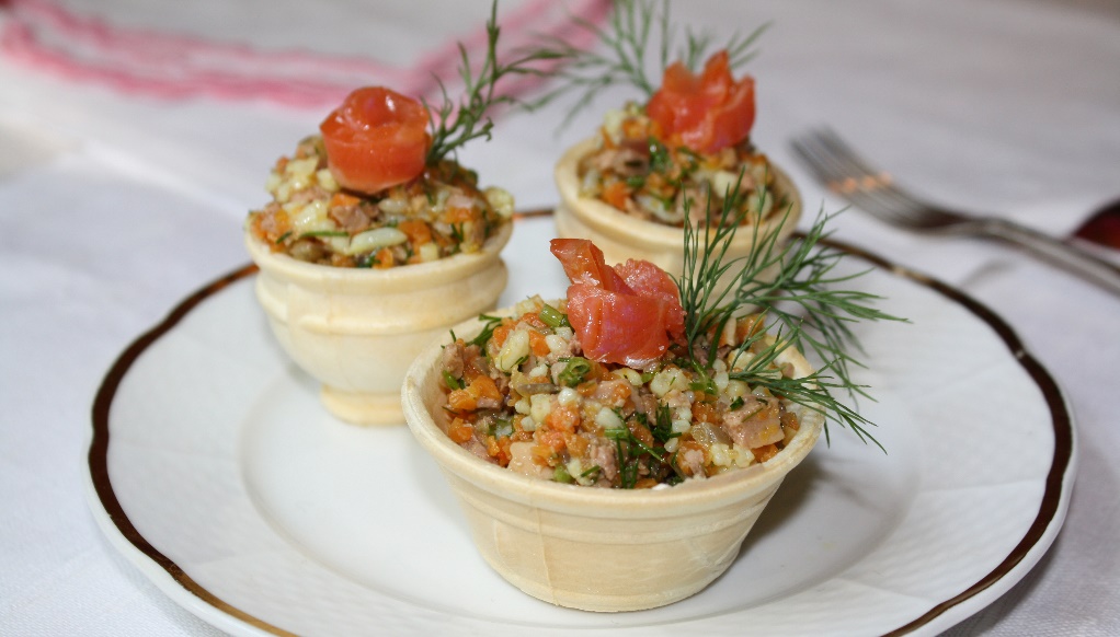 К печени добавить яйцо, лук, рис, зелень укропа, коньяк, перемешать. Приготовленной начинкой наполнить тарталетки.