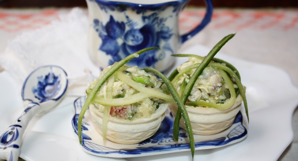 Смешать соус с креветками, выложить в корзиночки (на этом этапе можно дополнительно, в течение 5-10 минут, прогреть приготовленные тарталетки в теплой духовке).