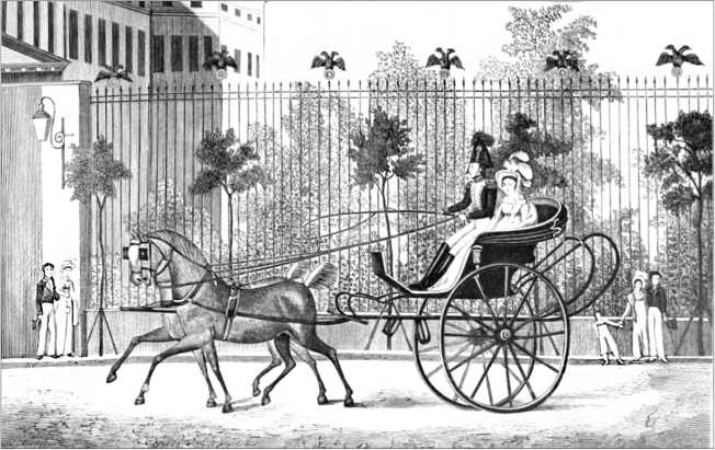Прогулка великого князя Николая Павловича и великой княгини Александры Федоровны в кабриолете (на заднем плане ограда сада и фасад Аничкова дворца)