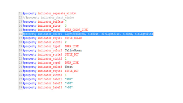 Давайте, модифицируем код индикатора ADX таким образом, чтобы раскрасить диаграмму ADX в четыре цвета, которые соответствуют описанным выше четырем торговым сигналам.