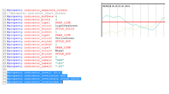 В результате добавления этих строк кода в индикатор ADX, у него появится горизонтальный уровень.