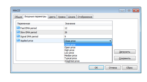 Например, для индикатора MACD – это периоды скользящих средних и тип применяемой цены.