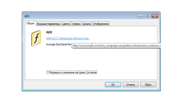 Теперь, на примере индикатора ADX, при присоединении индикатора к графику в MetaTrader 5, во-первых, откроется диалоговое окно индикатора, которое во вкладке Общие отобразит значения свойств copyright, link и description.