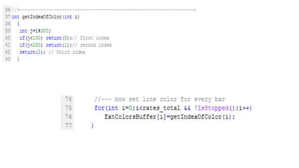 И, наконец, каждому элементу массива, представляющего буфер цвета индикатора, присваивается номер цвета, определенный в свойстве #property indicator_color.