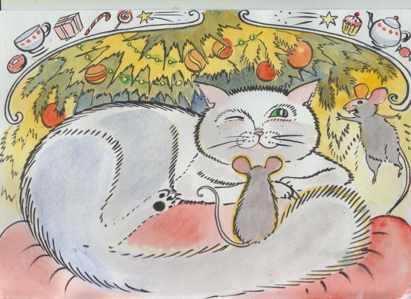 Когда они пришли на ёлку, то просто рты пораскрывали. Какая же она была огромная! Снизу до верху вся украшена шарами, игрушками и даже конфетами. Заиграла волшебная мелодия. Раздались апплодисменты. Кот и мыши сначала было присоединились, но вовремя спохватившись, юркнули под лавочку.