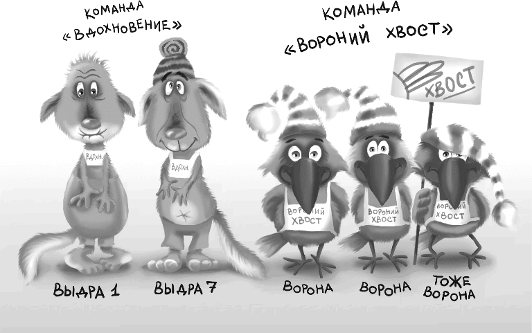 Потом выбежали ещё две команды. Команда ворон от гостиницы «Воронья радость» с очень глупым названием «Вороний хвост». Они хлопнули крыльями и прокричали: «Эй, ворона, взвейся ввысь! Да смотри не простудись!» И команда от музея с красивым названием «Вдохновение», которую представляли две старые выдры – смотрительницы залов.