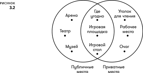 Потребуется небольшая смена парадигмы для того, чтобы взглянуть не на сами технологии, а на паттерны использования этих технологий в повседневной жизни, но это полезное упражнение, оно позволит нам взглянуть на прошлое, настоящее и будущее гейм-плея под совершенно новым углом. Я хотел бы поделиться с вами системой, которую я использую для определения мест действия с точки зрения их соотношения с гейм-плеем. Это не идеальная система – в ней есть как недочеты, так и перегибы, – но я часто обращался к ней, пытаясь понять, какому месту и времени лучше всего соответствует определенный тип гейм-плея.