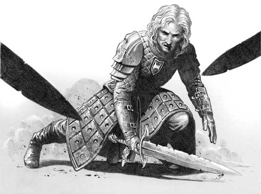Тяжко ему давалась эта наука. Каждая схватка заканчивалась лишь тогда, когда Джейехериса объявляли убитым. Убивали его столь часто, что стражники на стенах завели привычку кричать «король умер» всякий раз, как он падал, и «да здравствует король» всякий раз, как он поднимался. Противники его бились об заклад, кто сколько раз убьет короля; победителем, по слухам, вышел молодой Пейт-Кулик, от чьего копья Джейехерис никак не мог увернуться. К полудню король, к огорчению Алисанны, бывал весь в синяках и в крови, но под конец своего островного сидения стал таким добрым воином, что сам сир Элиас сказал ему так: «В Королевскую Гвардию, государь, вас не примут, но кабы дядя ваш Мейегор чудом восстал из могилы, я бы поставил на вас».