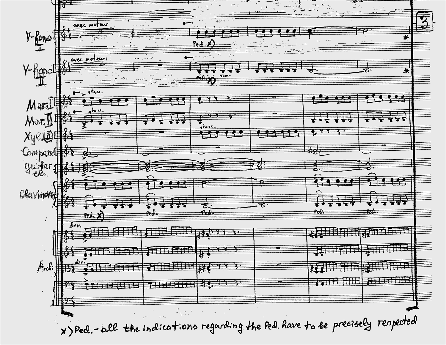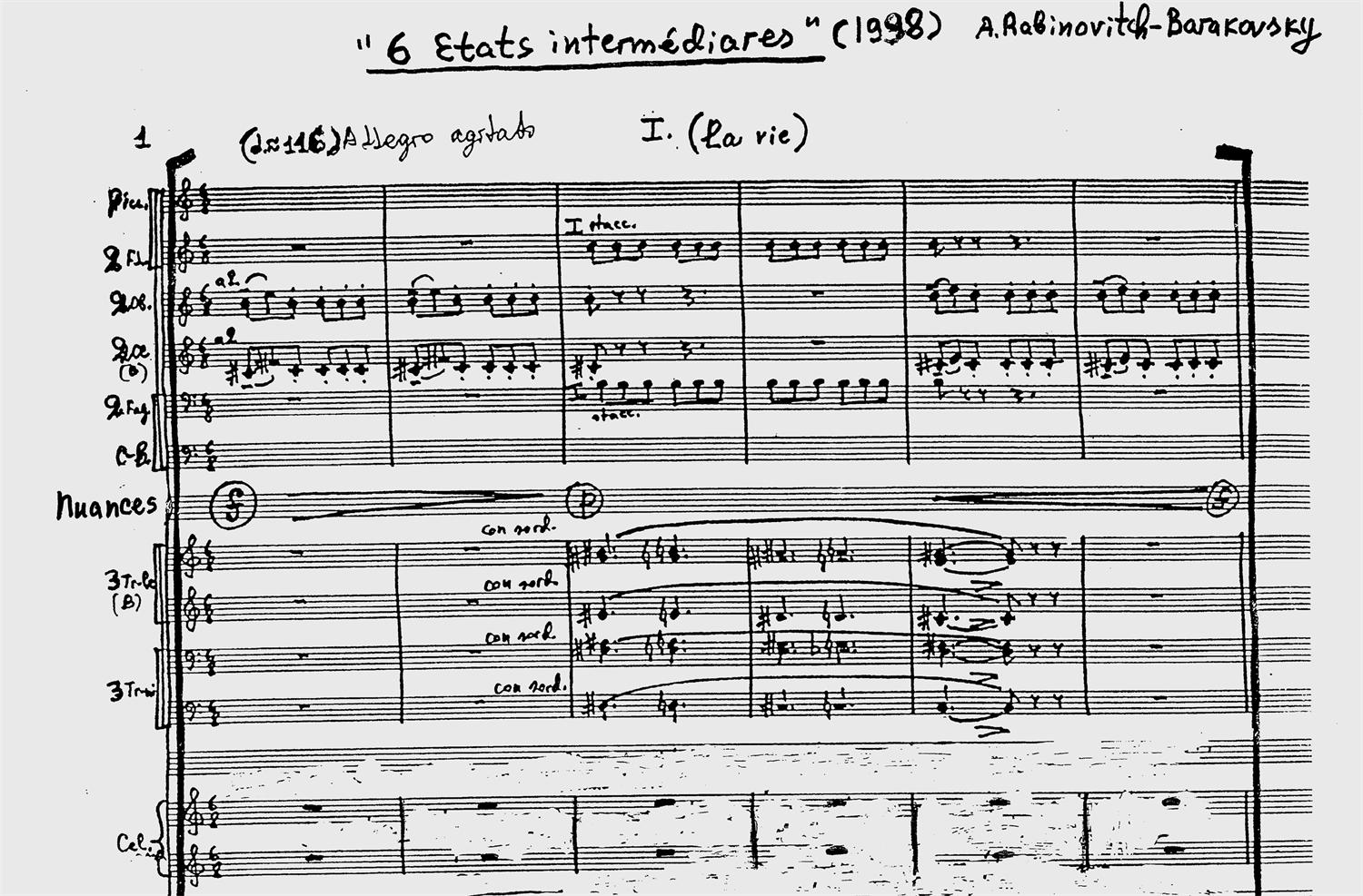 Фрагмент партитуры симфонии «Six etats intermédiaires» (1998). Симфония «Шесть промежуточных состояний» основана на тибетском буддийском тексте «Бардо Тхёдол» («Тибетская книга мертвых»). Композитор считает ее самым важным своим сочинением: «Я подумал, что если смыслом и главной целью философии для древних греков была подготовка к встрече со смертью, то почему бы и мне не последовать их замечательному примеру?» Задачей автора было «не столько музыкально проиллюстрировать содержимое „Бардо Тхёдол“, сколько найти аналогии и переклички в других традиционных культурах, а также в философии и психоанализе». Первая часть, «La vie» («Жизнь»), вдохновлена работами Карла Ясперса и посвящена реакции человека на пограничные ситуации.