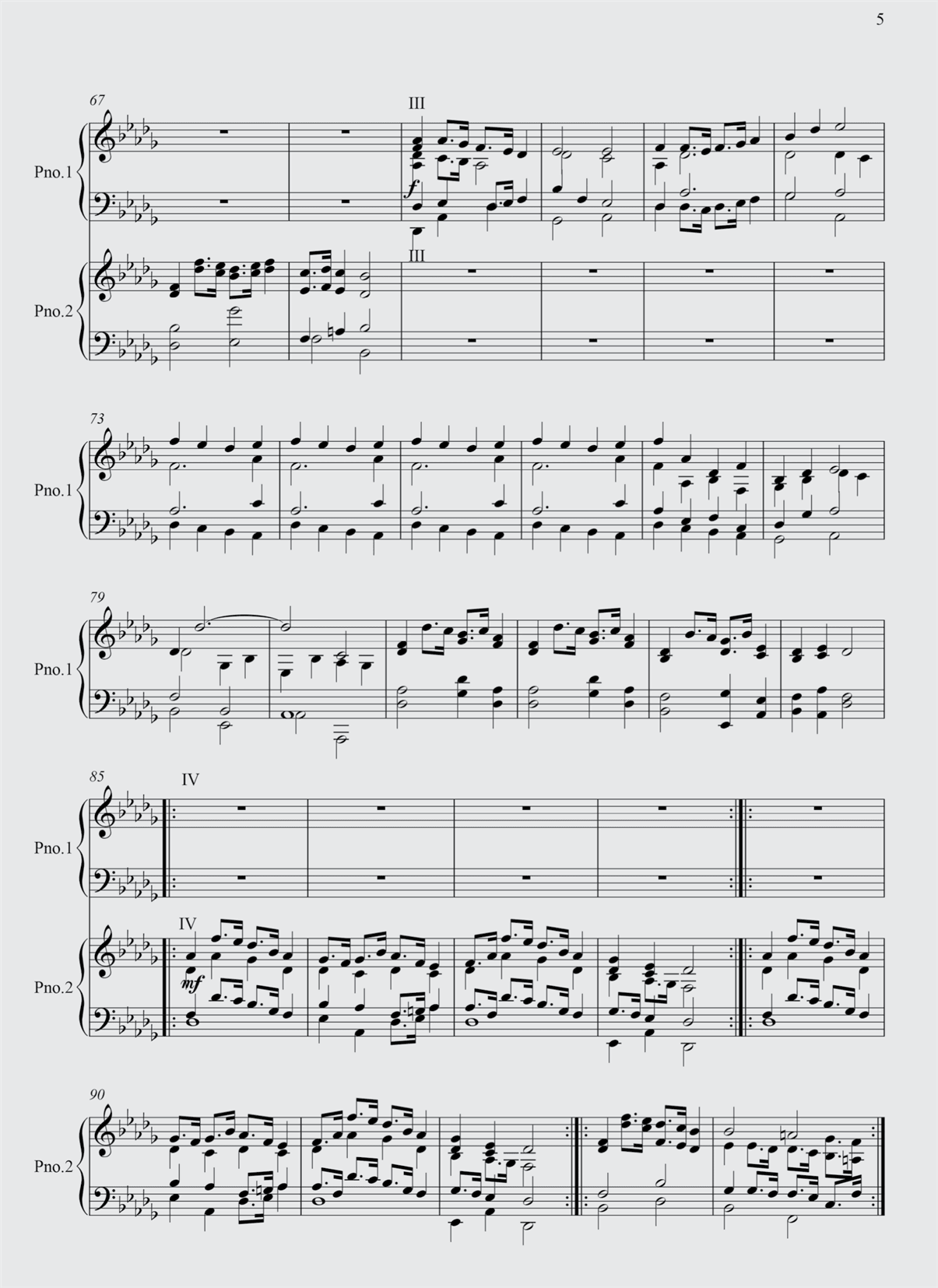 Фрагмент партитуры фортепианного цикла «Переписка» Владимира Мартынова и Георга Пелециса. На протяжении многих лет старые друзья, живущие в разных городах, а после распада СССР – и в разных странах, обменивались в письмах короткими фортепианными пьесами. Цикл, созданный по переписке, был начат в 1984 году с письма Георга Пелециса. В 2002-м цикл был исполнен авторами в концертном зале им. Чайковского, записан и издан на компакт-диске. На этой странице фрагмент III принадлежит Георгу Пелецису, фрагмент IV – Владимиру Мартынову.