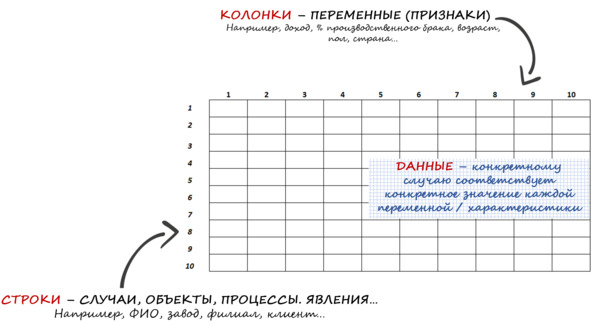 Столбцы\Колонки – это наши переменные, то есть характеристики этих случаев или объектов (доход, % брака, возраст, пол, страна и т.д.).