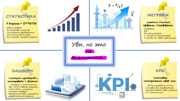 Сначала пройдемся по четырем моментам, которые в бизнесе порою жестко ассоциированы с аналитикой. Но таковой они не являются. Они все отражены на рис. 1.