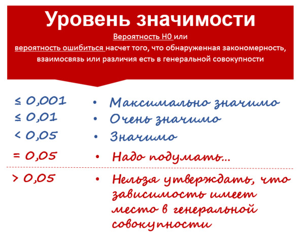 В целом, общепринятая интерпретация вероятности ошибки (или значимости результатов) в среде аналитиков следующая (рис. 15):