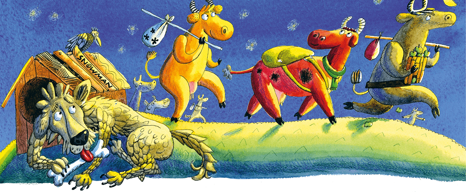 Лишь пёс Дружок никак не мог заснуть. Он скучал, грыз косточку и тихонько выл на луну. Вообще-то говорят, что, когда не спится, надо считать овец. Дружок насчитал их уже тысячу, но это не помогло. Вдруг он увидел, как вдали на фоне ёлок друг за другом движутся коровьи силуэты, и тоже начал считать: