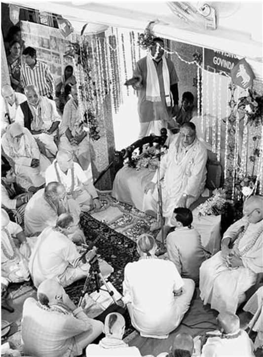 Шрила Гуру Махарадж очень доволен тем, что каждое утро мы ведем философские беседы на английском языке в его самадхи-мандире «Храм единения в разлуке». Этот храм построен для того, чтобы служить в нем Шриле Гуру Махараджу, а не для того, чтобы им любоваться. Настоящее служение – это прославление вайшнавов, возглавляемых им и его сподвижниками. Мы будем и впредь каждый день собираться здесь и слушать, как последователи и преданные Шрилы Гуру Махараджа прославляют его.