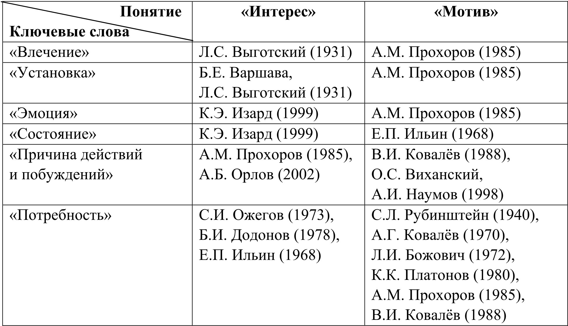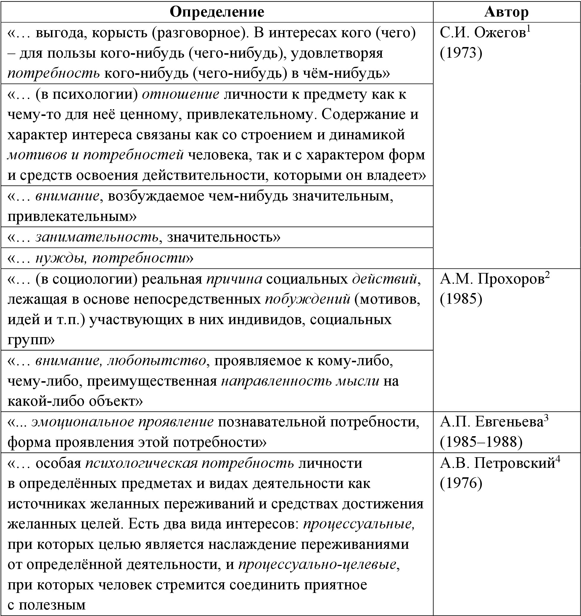 Отметив значительный интерес учёных и практиков к данной проблеме, обратимся к анализу сущности понятий «интерес», «мотив», «потребность» и «мотивация» (табл. 1.2, 1.3, 1.5–1.6).
