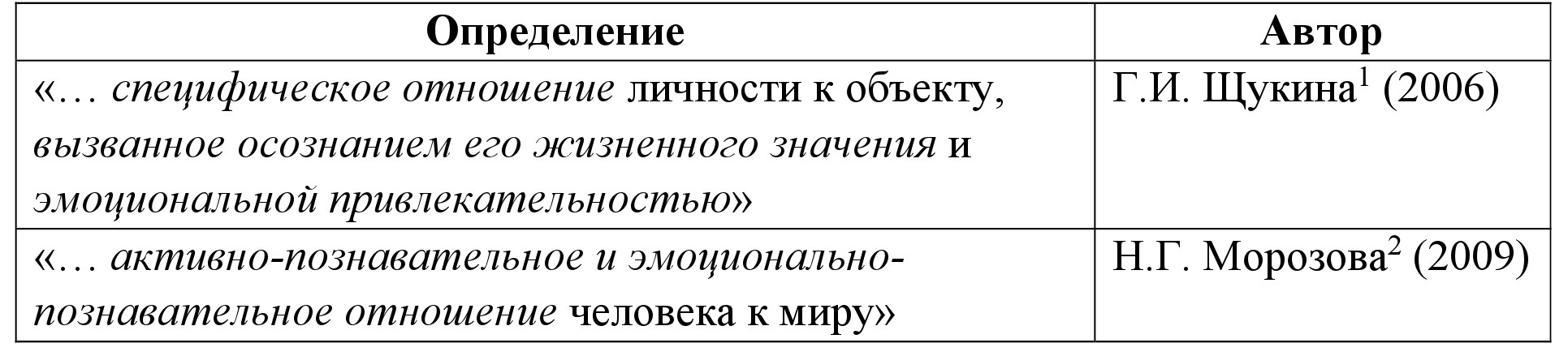 Морозова Н.Г.Как видно из данных табл. 1.2, для раскрытия сущности понятия «интерес» ключевыми словами выступают: «стремление», «влечение», «установка», «направленность на (объект, деятельность)», «внимание», «занимательность», «нужда», «потребность», «мотив», «причина действий и побуждений», «эмоциональное состояние», «отношение», «эмоция», «мотивация», «любопытство», «желательность объекта», «потребностное отношение к объекту», «осознание значимости и эмоциональной привлекательности объекта».