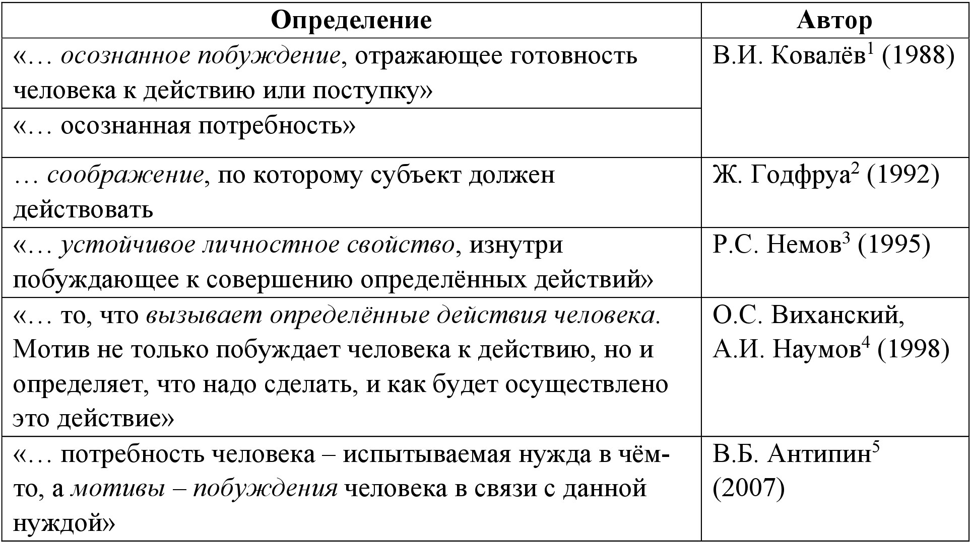 Признавая справедливость данной точки зрения, приведём сводную таблицу определений понятия «мотив» (табл. 1.3).