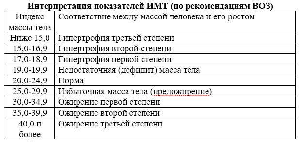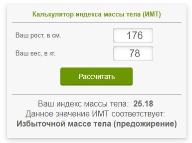 Ещё один показатель, который часто используется диетолагами – индекс массы тела (ИМТ), один из самых известных и всеобще признанных индексов. Он легко высчитывается и зависит от веса и роста, его значение определяет риск развития сердечно-сосудистых патологий. Чтобы высчитать ИМТ, необходимо разделить вес в килограммах на квадрат роста в метрах. ИМТ = вес (кг) / рост² (м), но и здесь достоверность этого показателя страдает, когда дело касается «качков», так как их ИМТ всегда будет указывать на ожирение различных стадий. Опять же в моём случае, тот вес к которому я так стремился, в соответствии с этим расчётом говорит мне о том, что я в предожирении1