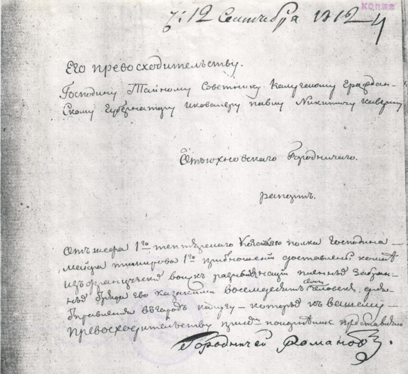 От шефа 1-го тептярского Казачьего полка господина майора Тимирова 1-го при отношении доставлены ко мне из французских войск разных наций пленных забранных отряда его казаками восемьдесят семь человек для отправления в город Калугу – которые к вашему превосходительству при сем покорнейше представляю. Городничий Романов, сентября 9-го дня».