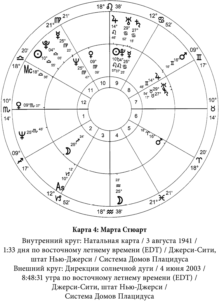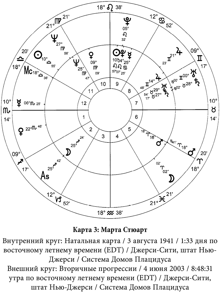 Девятый Дом связан с правовой системой и массовыми публикациями, а двенадцатый – с тюрьмами. В карте Марты (карта 3) в натальном девятом Доме находятся три планеты, указывающие на ее издательскую империю и возможные проблемы с законом – Солнце, Плутон и Меркурий. Планеты-управители указанных Домов таковы: Венера (двенадцатый Дом) и Луна (девятый Дом). Легко предсказать активные прогрессии, задействующие некоторые (или все) из этих планет в период, когда у Марты были проблемы с законом, и расположение их в соответствующих Домах, девятом и двенадцатом.