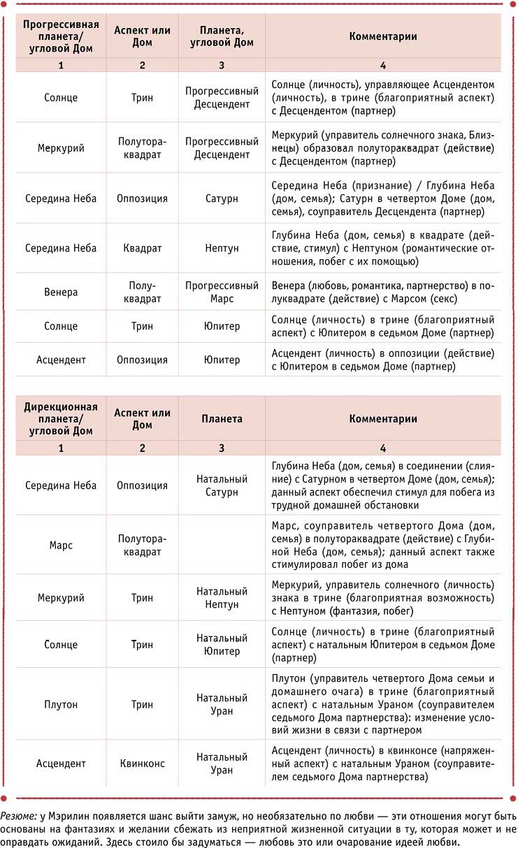 Прогрессивное Солнце образовало секстиль/трин с прогрессивным Асцендентом/Десцендентом, а прогрессивный Меркурий (управитель ее солнечного знака, Близнецы) находился в квадрате/полутораквадрате с теми же угловыми Домами. Когда Мэрилин вышла замуж, условия ее жизни поменялись, что отражено в оппозиции прогрессивной Середины Неба и натального Сатурна (соуправителя седьмого Дома), находящегося в четвертом Доме (домашний очаг). Прогрессивная Середина Неба также образовала квадрат с натальным и прогрессивным Нептуном, что указывает на «побег» Мэрилин из приюта в ту ситуацию, которую она, вероятно, считала наилучшим выходом. К моменту заключения брака прогрессивная Луна была в расходящемся трине с Венерой – этот аспект был точным месяцем ранее, когда, по всей вероятности, было принято решение о свадьбе.