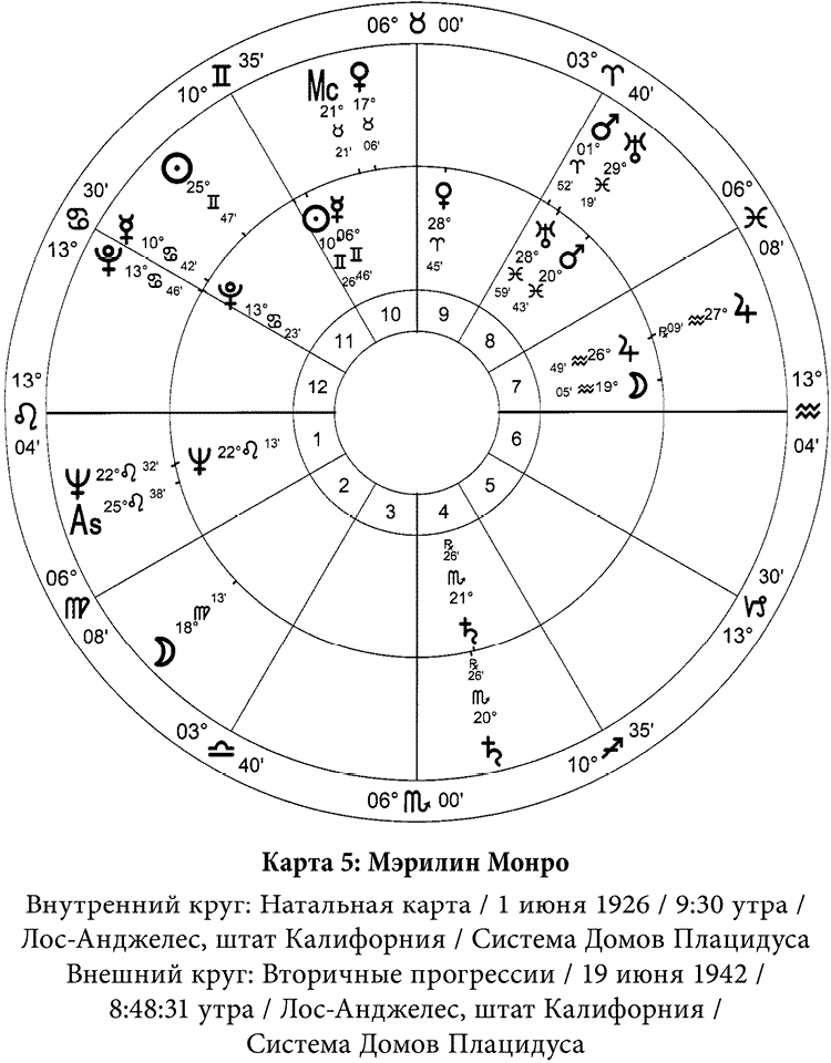Влияние прогрессий и дирекций солнечной дуги в карте Мэрилин Монро