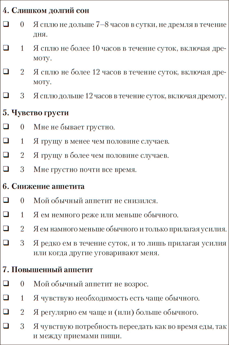 Экспресс-опросник по симптомам депрессии (QIDS) использовался в самом обширном из когда-либо проводимых исследований депрессии. Вы можете применять его по своему усмотрению и повторно обращаться к нему на протяжении следующих нескольких месяцев (или в любое время) для оценки своего состояния.