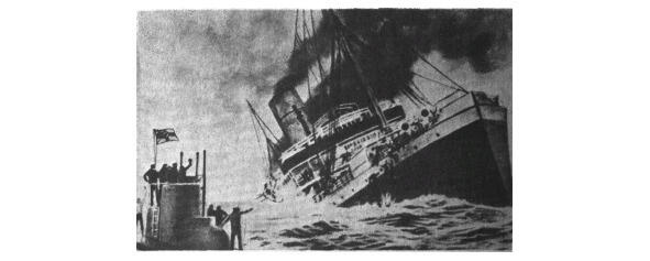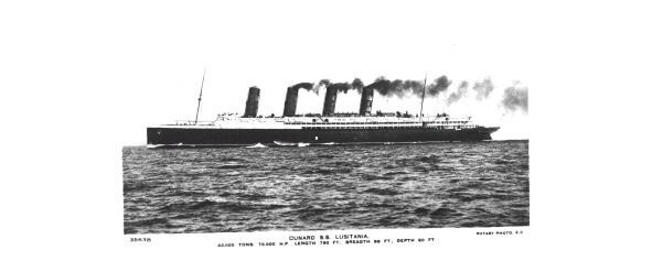 «Лузитания» английский пассажирский пароход водоизмещением 30 тыс. т, спущен на воду в 1906 году, введён в эксплуатацию в 1907 году, был потоплен 7 мая 1915 года германской подводной лодкой недалеко от берегов Ирландии, после объявления Германией блокады британских островов. Погибло 1154 чел., из них 114 пассажиров-американцев. Вверху открытка начала XX века. Внизу рисунок из учебника «Новая история», под ред. И. М. Кривогуза, М., «Просвещение», 1988.