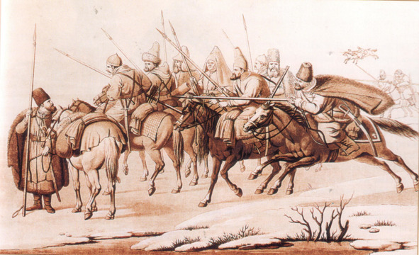 Первые казаки в Берлине 20 февраля 1813 г. (второй-четвёртый и седьмой слева – башкиры, пятая-башкирка в платке). Худ. И. Ф. Югель. 1813 г.