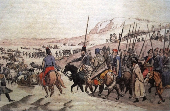 16 (28) января 3-я Западная армия Чичагова (17 тыс. человек) блокировала Торн (Торунь). 24 января (5 февраля) 1813 г. Главная армия подошла к Висле и заняла Плоцк, а авангард Винценгероде – город Доброжин. В Главной армии было 9 казачьих полков. Милорадович, присоединив к себе корпус генерал – лейтенанта Остен – Сакена, наступал на Варшаву. Его войска насчитывали 36 тыс. человек40. В том числе, в его составе на 28 января находился и 2-й Башкирский казачий полк под общим началом генерал-лейтенанта князя Д. М. Волконского. В январе-мае и 1-й Тептярский полк состоял в казачьем отряде войск М. А. Милорадовича и участвовал в боевых действиях в герцогстве Варшавском. Русским наступлением на Варшаву планировалось подвинуть или разгромить австро – саксонскую группировку войск и занять столицу Великого Герцогства Варшавского. Эта задача была возложена на российские войска, находившиеся в районе городов Гродно, Белосток, Брест – Литовск. Ими командовал Милорадович. Между этими двумя группировками из района Меречи в общем направлении на Плоцк наступала Главная армия во главе с Кутузовым. Очевидец Михайловский – Данилевский так описывает состояние Польши на тот момент: «Вскоре въехали мы в Варшавское герцогство; оно совсем не так разорено было, как русские губернии, служившие театром войны; дома и строения крестьянские стояли невредимы, между тем как у нас всё было вызжено до основания»41.