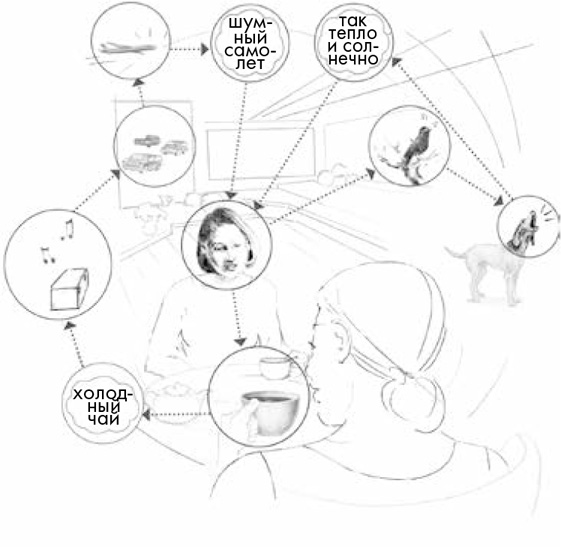 Рисунок 7. Ум сканирует, увлекается чем-то или чередует эти два вида спонтанного движения. При сканировании фокус внимания перемещается от объекта к объекту в поисках чего-то интересного. Если поиск ни к чему не привел, внимание возвращается к первоначальной точке.