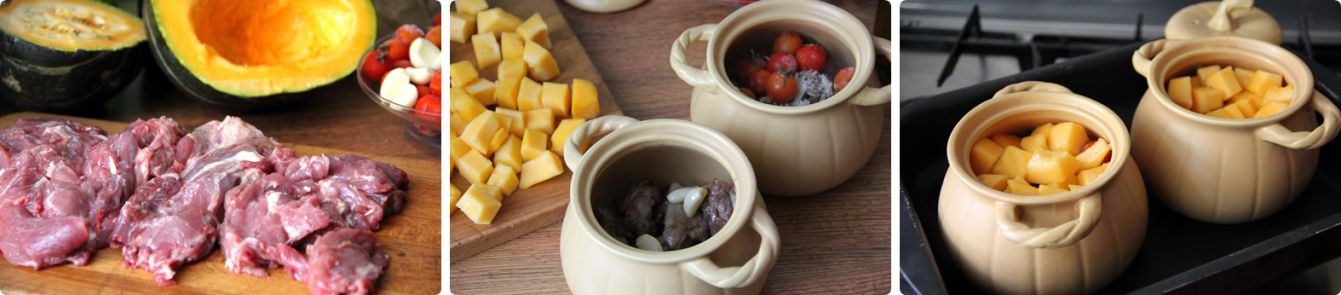 Разогреть масло в сковороде, посолить кусочки мяса и обжарить чеснок и мясо с обеих сторон до зарумянивания. Переложить их в керамические горшочки, добавить мелкие томаты, посыпать сыром. Добавить нарезанную крупным кубиком тыкву. В сковороду, где жарили мясо и чеснок, влить вино, прокипятить 1-2 минуты и влить в горшочки. Поставить горшочки в разогретую до 200°С духовку на 80-90 минут.