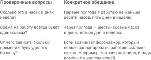 Для удобства я сделал шпаргалку: основные темы и примеры вопросов. Это вопросы о ценностях компании, ролях партнеров, их совместном вкладе (в том числе вкладе рабочего времени), ответственности, зарплате и даже правилах и порядке выхода каждого из партнеров из бизнеса. Для удобства я привел эти вопросы на следующей странице.