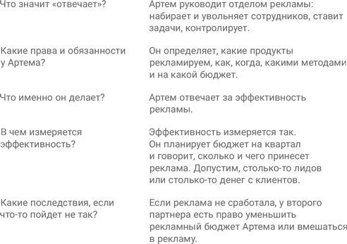 Письменные договоренности защищают от общих фраз. В разговоре слышишь: «Я отвечаю за рекламу». Вроде картинка в голове нарисовалась, ты согласен и обсуждаешь следующий вопрос. На самом деле это пустая фраза, за ней ничего нет. Сравните: