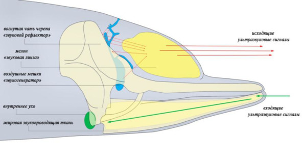 Дельфины используют свыше 10000 различных звуков, в том числе и звуки, на частотах, недоступных нашему слуху. Ультразвук используется дельфинами как для общения, так и для навигации (возвращаясь в виде отраженного звука он, через полые кости нижней челюсти попадает на внутреннее ухо, благодаря чему формируется картинка, наподобие снимка УЗИ, в голове у дельфина) [1; 4].