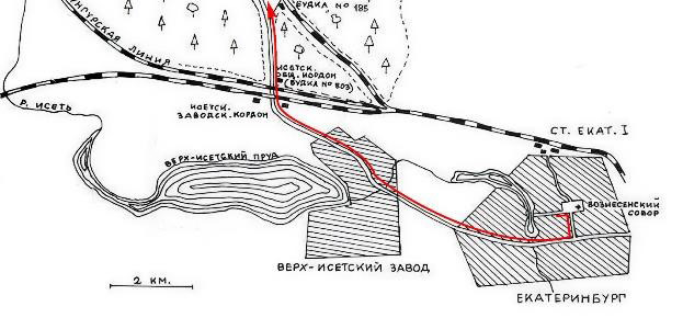 «… Далее, пройдя через Верх-Исетский завод, дорога направляется к кордонам на Казанской и Пермской железнодорожных линиях и, перейдя обе линии, вступает в густой смешанный, заросший лес…»